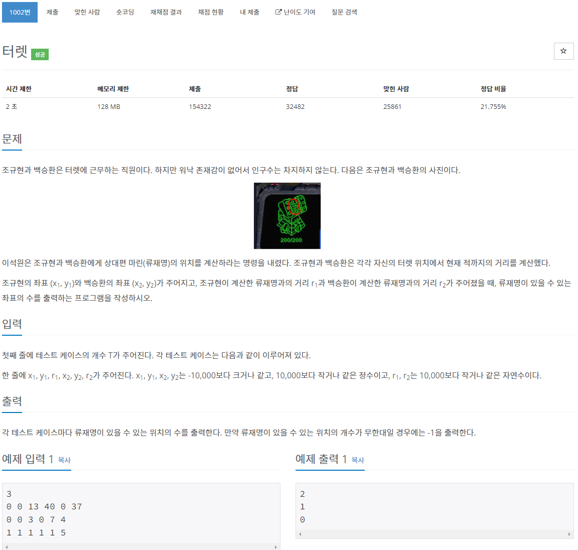 [단계별로 풀어보기][python 3] 기본 수학2 - 터렛 (1002)