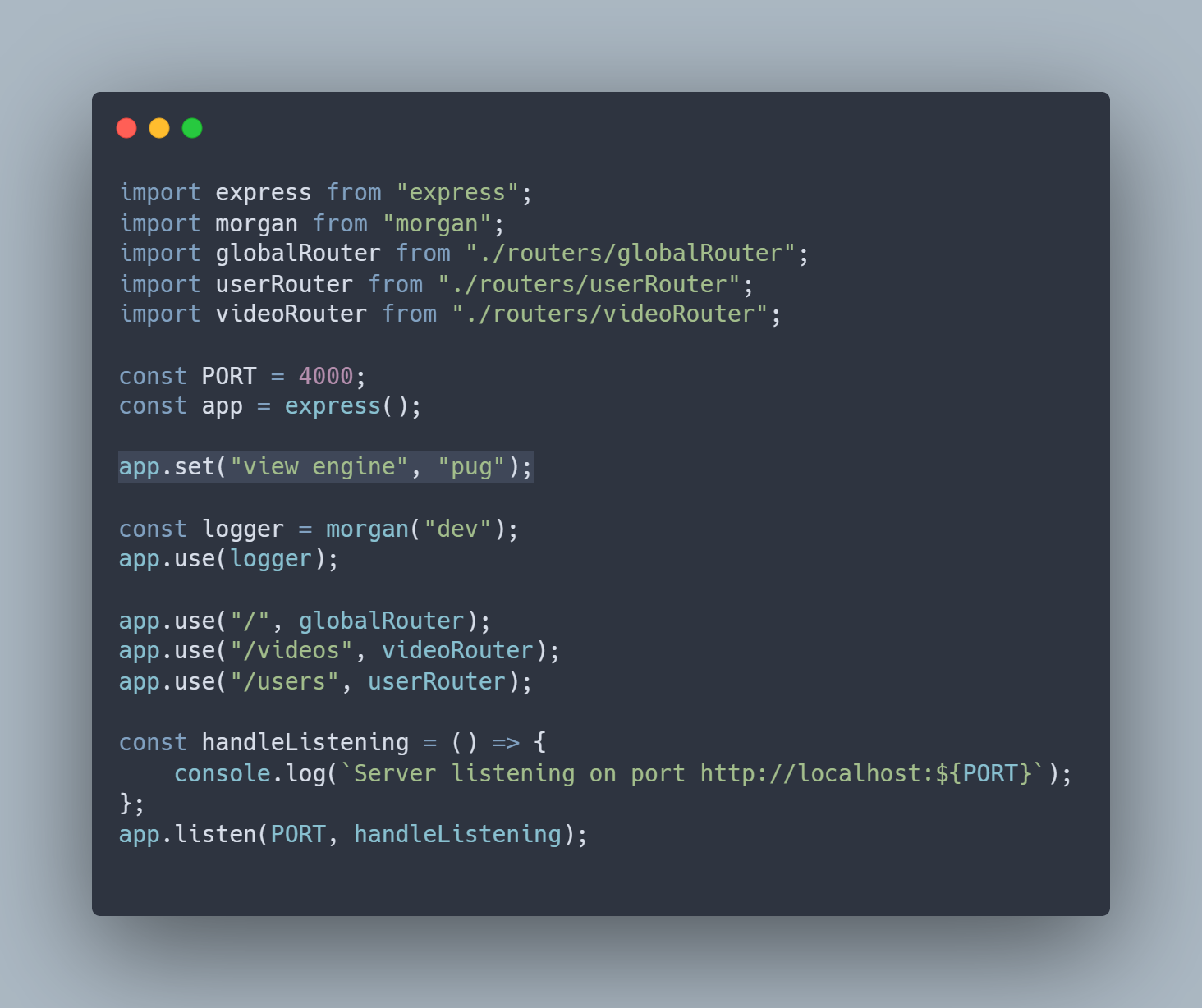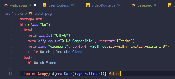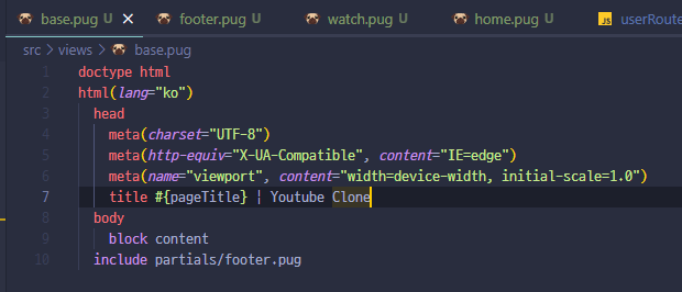 app.set()을 이용해 server.js에 위와 같이 설정해주면 Express가 View Engine으로 Pug를 사용하기 시작한다.