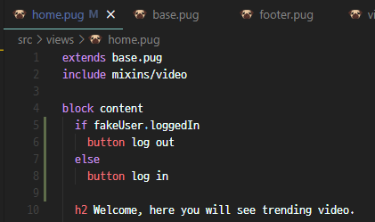 가짜 유저 객체를 만들어서 home.pug에 넘겨준 뒤 다음처럼 조건식을 설정해본다.